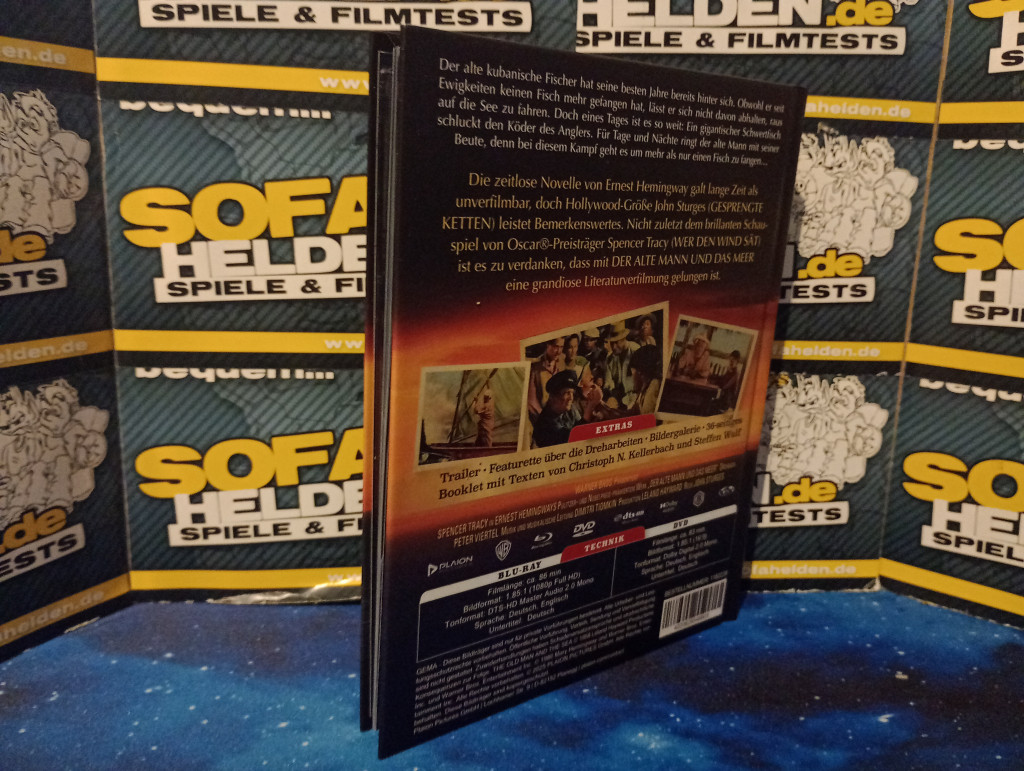 Während auf der Rückseite des Mediabooks die üblichen Inhaltsangaben und Details direkt aufgedruckt wurden, bietet das Cover das bereits von der DVD-Veröffentlichung bekannte Motiv eines nachdenklichen Spencer Tracy. Ein mattes Finish sowie die dezente, in Brauntönen gehaltene Farbgestaltung sorgen dabei für einen harmonischen nostalgischen Look. Der sehr dezente Innendruck besteht aus einer Kollage von Szenenbildern und wird - wie auch die Discs - von seiner blauen Färbung dominiert. Ein 36-seitiges Booklet mit einer umfassenden Entstehungsgeschichte zum Film von Christoph N. Kellerbach sowie einem Interview von Steffen Wulf mit dem finalen Drehbuchautor Peter Viertel rundet das Mediabook zusammen mit zahlreichen Szenenaufnahmen und Filmplakatmotiven sehr schön ab.