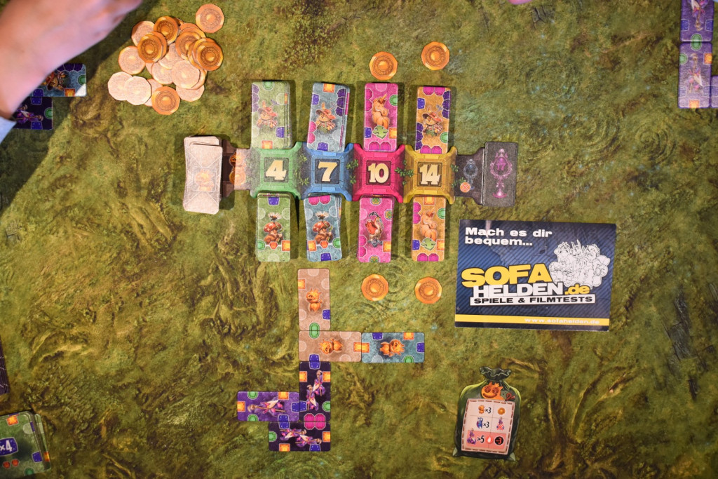 Für den Spielaufbau nehmt Ihr das Markttableau und legt es in die Tischmitte. Die Plättchen sortiert Ihr anhand Ihrer Rückseiten und mischt jeden Stapel gut durch. Anschließend teilt Ihr jeden in zwei auf und legt sie offen auf die beiden Seiten des Markttableaus mit der entsprechenden Zahl. Die Plättchen mit den Glücksschweinchen legt Ihr an das linke Ende, das Siegplättchen an das rechte Ende. Nun nehmt Ihr die Münzen und legt sie als Vorrat bereit. Sechs von Ihnen legt Ihr an jeden Stapel außer den beiden Vierern. Anschließend nehmt Ihr Euch jeweils einen Beutel und füllt ihn mit den Startplättchen auf: vier einzelne Gnome, zwei Doppelgnome und zwei Glücksschweinchen. Dann erhält die jüngste Person den Startmarker und Ihr beginnt das Spiel.