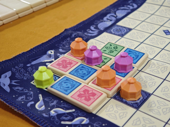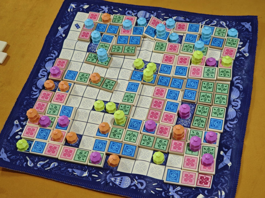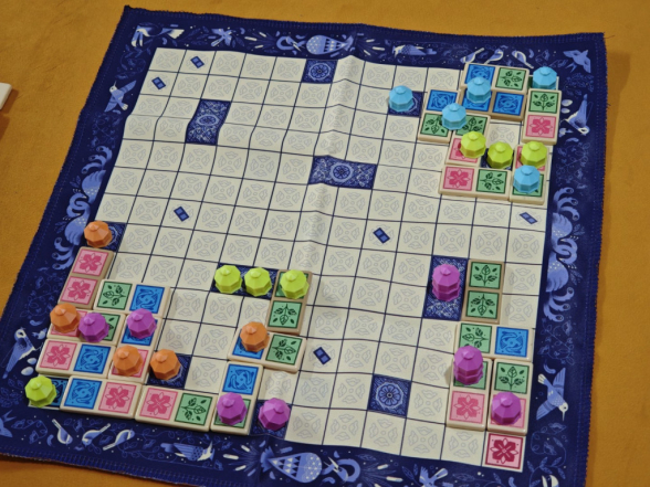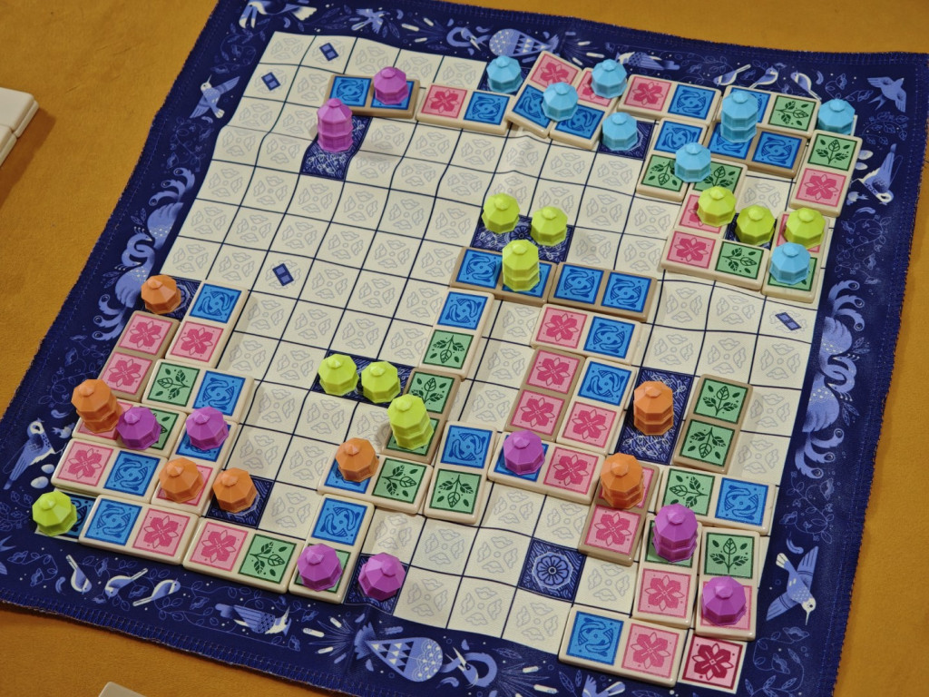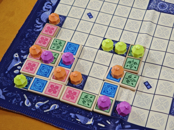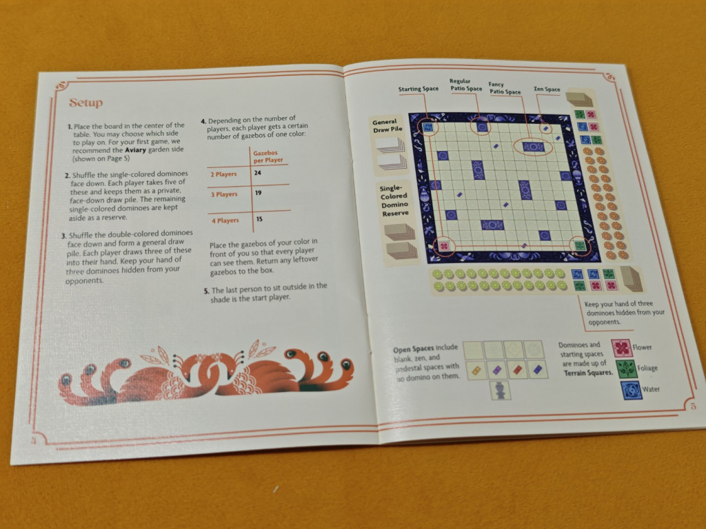 Der Spielplan ist übrigens doppelseitig. Beide Seiten zeigen verschiedene Anordnungen dieser Spielelemente, um Abwechslung zwischen den Partien zu ermöglichen. Der orangene Spielplan zeigt zusätzlich Felder mit Vasen, die beim Abdecken mit einem Domino einen weiteren Spielerzug ermöglichen. Zuletzt wird ein Startspieler ausgewählt. Dann geht es los.