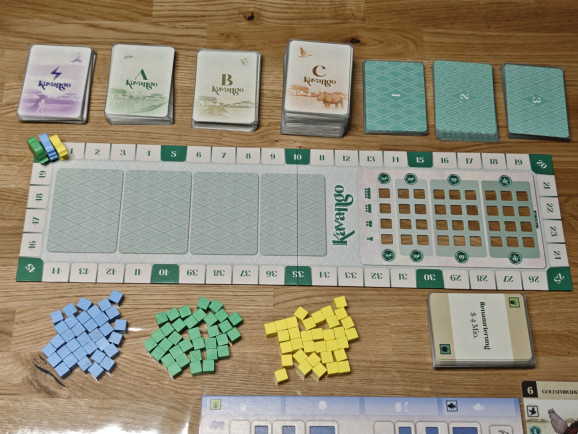 Kavango besteht hauptsächlich aus Karten, richtig vielen Karten. So gehört es sich für ein Drafting Spiel. Und was braucht ein Drafting Spiel noch? Ein Board für die persönliche Kartenauslage. Nun, eigentlich könnte man die gespielten Karten auch einfach auf den Tisch legen, die Anordnung spielt ohnehin keine Rolle. Dennoch hat jeder Spieler sein eigenes Board in Spielerfarbe, mit individuellem Artwork, das Platz für ein Raster aus 3 x 8 Karten bietet. Zusätzlich gibt es ein paar Holzkomponenten, und doppellagige Tableaus, das war’s dann auch schon. Die Schachtel ist bis oben hin voll und die Materialqualität super. Ein paar Upgrades gibt’s allerdings noch in der Kickstarter-Version, z.B. Material für einen fünften Spieler und screen-prints auf den Holz-Meeplen. Ob man das braucht, muss jeder selbst entscheiden.