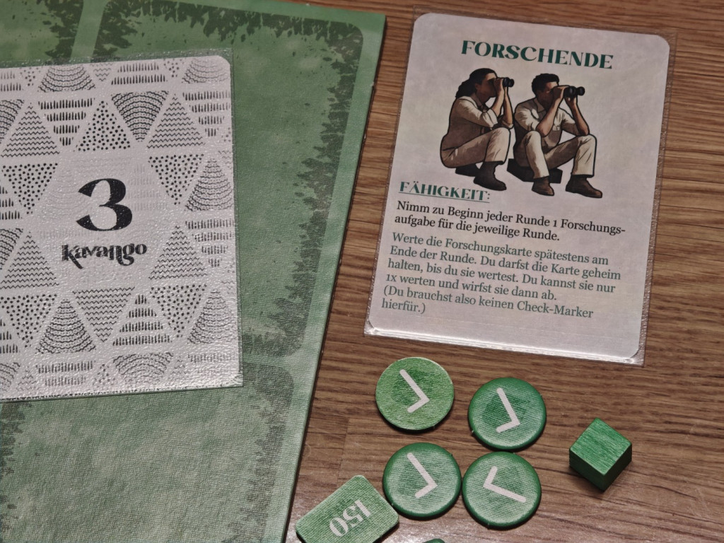 Jeder Spieler nimmt sich nun das Material in seiner Spielerfarbe: grün, orange, blau oder gelb. Dazu gehören die Geldmarker, kleine Holzwürfel. Diese kommen allerdings beiseite, in einen Vorrat, von dem aus man sich bedient, immer dann, wenn man Geld erhält. Man kann mit einem Startkapital von 0-2 Geldmarkern spielen, je nach Lust und Laune. Außerdem nimmt sich jeder Spieler seine Tierfigur, die auf die Siegpunkteleiste des Spielplans platziert wird, zwei Zählchips, die benötigt werden, wenn die Tierfigur die 50 Punkte-Marke knackt, und vier Checkmarker, mit denen man im Spielverlauf erfüllte Forschungsaufträge markiert.
