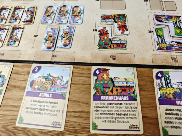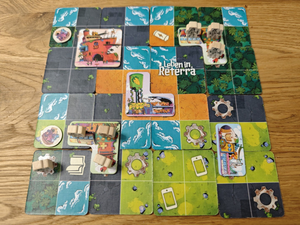 Außerdem wird man versuchen Zahnrad-Symbole auf identischen Terrains benachbart zueinander zu platzieren. Von Zahnrad-Symbolen hatten wir es noch nicht, weil sie an sich keine Siegpunkte geben. Aber nur auf Feldern mit Zahnrad-Symbolen können Gebäude-Plättchen gebaut werden; Und zwar auch nur dann, wenn sich alle Zahnrad-Symbole, die von einem Gebäude-Plättchen überbaut werden sollen, auf identischem Terrain, z.B. Wiese, befinden. Hier wird der Puzzle-Charakter von Leben in Reterra deutlich.