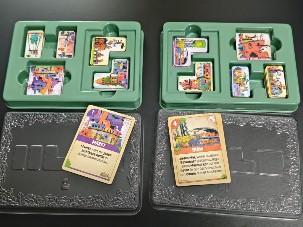 Das auffälligste an Leben in Reterra sind wohl die durchdachten Plastik-Trays für Gebäude-Plättchen und Gebäude-Karten, mit transparentem Deckel. Das Grundspiel kommt mit vier Trays, von denen drei für die drei Gebäude-Sets verwendet werden. In jeder Partie spielt man nur mit einem dieser Sets. Die Trays sind auf einem Crowdfunding Deluxe-Niveau, und es hat uns richtig überrascht so etwas in einem Retail Spiel mit einem UVP von 35 EUR vorzufinden. Die Erweiterung kommt mit zwei weiteren Gebäude-Sets, also zwei weiteren Trays. Abseits der Trays überzeugt das wirklich wunderschöne und einzigartige Artwork auf Karten und Gebäude-Plättchen. Und eines muss man den Entwicklern lassen: für jedes Gebäude-Set ein eigenes Set Gebäude-Plättchen mitzuliefern, das sich letztlich nur im Artwork unterscheidet, hätte spielmechanisch nicht sein gemusst. Aber wir haben es bekommen. Zu unserer Freude.