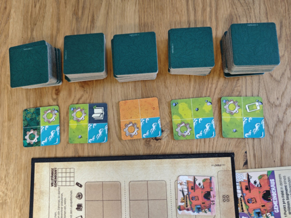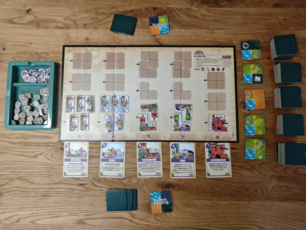 Schauen wir uns nun die Spielvorbereitung an. Leben in Reterra ist ein schnell gespieltes Spiel, dementsprechend sollte der Aufbau auch nicht lange dauern. Tut er auch nicht. Zentrale Spielkomponente sind die