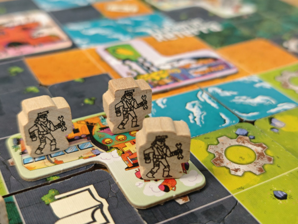 Nachdem man das Landplättchen platziert hat, darf man in Schritt 2 entweder ein Gebäude oder einen Bewohner platzieren, aber nur eines davon und nur einmal. Außerdem auch nur auf ein Zahnrad-Symbol des gerade platzierten Landplättchens. Man muss sich also gut überlegen, ob man Bauplätze auf Zahnrädern später durch weitere Zahnräder vergrößert, um größere Gebäude zu bauen, oder direkt einen Bewohner oder ein kleineres Gebäude baut. Sollte man später kein passendes Zahnrad mehr erhalten, lässt sich in der Regel nachträglich kein Gebäude oder Bewohner mehr platzieren.