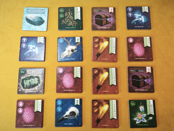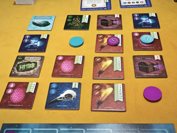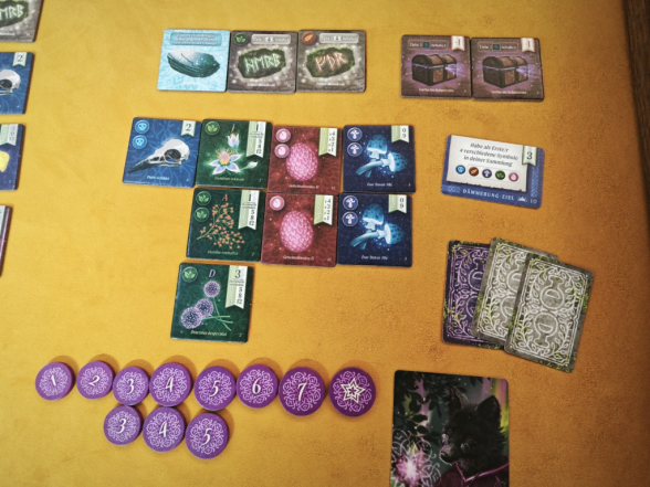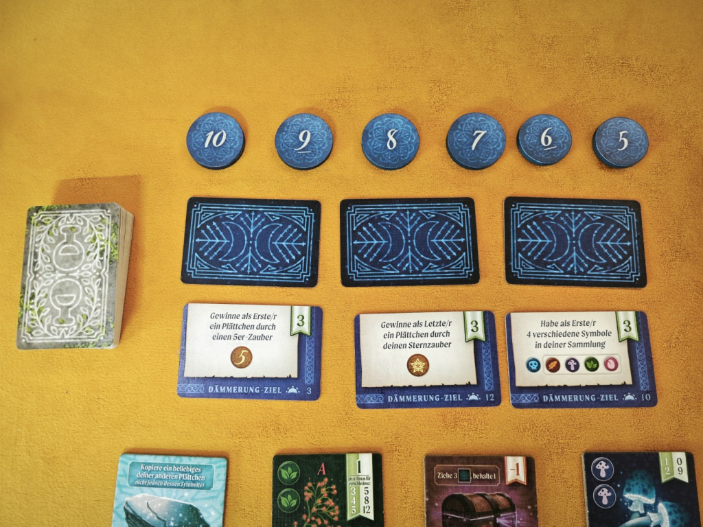 Ich hatte bereits in der Wertung die meisten Plättchen-Arten erklärt: diese geben Siegpunkte im Rahmen von Set Collection Regeln, die auf den Plättchen aufgedruckt sind. Es gibt aber noch drei weitere Plättchen-Arten: Spiegelsteine können in der Wertung als beliebiges Plättchen gezählt werden. Verfluchte Schatztruhen erlauben es direkt drei Plättchen von einem verdeckten Stapel zu ziehen und sich eins davon auszusuchen. Und uralte Runensteine ermöglichen es drei Mixtur-Karten vom Stapel zu ziehen und sich hiervor eine auszusuchen. Zuletzt ist noch wichtig zu bedenken: sobald eine Dämmerung-Zielkarte von einem aktiven Spieler erfüllt wird, darf er sich diese Karte nehmen und bekommt am Spielende die entsprechenden Punkte.