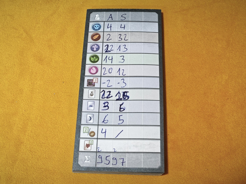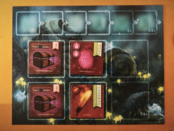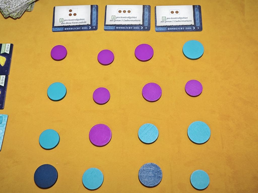 Viele Siegpunkte gibt es auch für die Erfüllung von Zielen: die Start-Mixturkarte und alle weiteren Mixturkarten, die man über Plättchen mit uralten Runensteinen erhalten hat geben Punkte, wenn man die abgedruckten Symbole auf Plättchen in seiner Auslage hat. Dämmerung-Zielkarten sammelt man im Durchgang 1 und Mondlicht-Zielkarten kann man im zweiten Durchgang erfüllen; erfüllte Zielkarten geben meist jeweils 3 Punkte. Zaubermarker, die man in Durchgang 2 nicht verwendet hat, sind nochmal 2 Siegpunkte wert. Zuletzt gibt es noch einen Siegpunkt Abzug für jedes Plättchen mit einer verfluchten Schatztruhe – aber keine Angst: sie sind es wert gewesen.