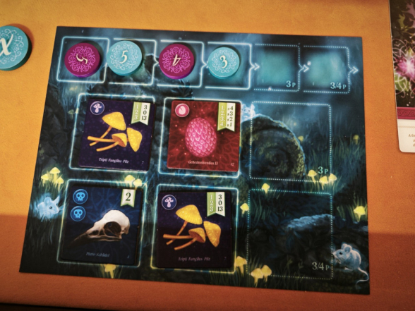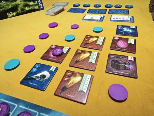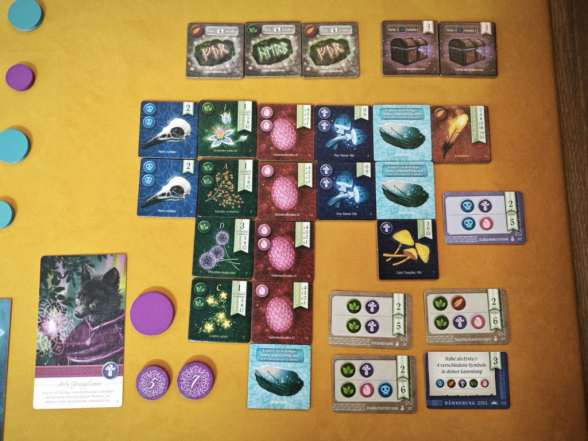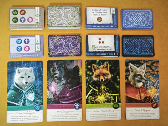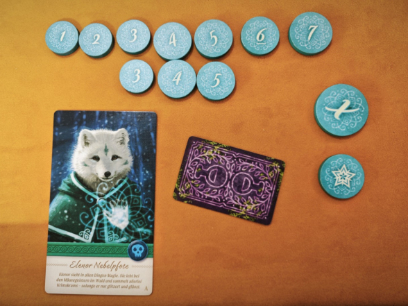 Neben den Zaubermarkern in Spielerfarbe gibt es noch die Schatten-Zaubermarker. Sie werden offen ausgelegt und können am Ende des ersten Durchgangs erhalten werden, um den eigenen Pool an Zaubermarkern zu verbessern. Nun kann es losgehen: der Spieler, der zuletzt im Wald war, beginnt.
