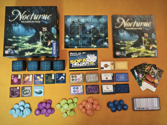 Nocturne gewinnt derjenige Spieler, der zum Spielende die meisten Siegpunkte gesammelt hat. Während des Spiels gibt es keine Siegpunkte festzuhalten. Alles wird in der Endwertung verrechnet, mithilfe eines praktischen Wertungsblocks. Wofür gibt es Punkte? Die ersten fünf Wertungskategorien entsprechen den fünf Objekt-Plättchen-Arten mit den Symbolen Schädel (blau), Feuerfeder (braun), Pilz (lila), Kräuter (grün) und Ei (pink). Schädel geben die abgedruckten Siegpunkte, Feuerfedern geben mehr Siegpunkte, je mehr man davon hat, Pilze geben Siegpunkte abhängig von Anzahl und Typ, und so weiter.