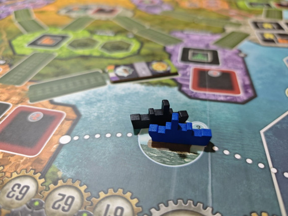 Möglichkeit 2: Ein Aktionsplättchen als Gleis auf den Spielplan legen. Diese Aktion, die dein Netzwerk auf dem Spielbrett ausbaut und oft Bonusaktionen durch farbig-passendes aneinanderreihen von Aktionsplättchen auslöst, bietet jetzt noch etwas mehr. Als Belohnung für deinen Schienenbau kannst du auf einigen Eisenbahnfeldern jetzt auf kleine Uranfunde stoßen. Platziere dort ein Gleis, und du erhältst sofort ein Uran, das du in eine deiner Uranminen legen musst. Die größte Neuerung im Kontext der „Netzwerke“ sind aber die Schifffahrtswege, die nicht über Gleise, sondern mittels Boote funktionieren. Diese Verbindungen sind eine völlig neue Art der Netzwerkexpansion. Sie funktionieren ähnlich wie deine Eisenbahnlinien, um dein Netzwerk zu erweitern, aber Vorsicht: Sie gelten nicht als Eisenbahnplättchen für Meilensteine, Verträge oder Technologien. Und noch wichtiger, wie eingangs schon erwähnt: obwohl du mit deinen Booten Kohle und Uran verschiffen kannst, können Schiffe keine Elektrizität leiten.