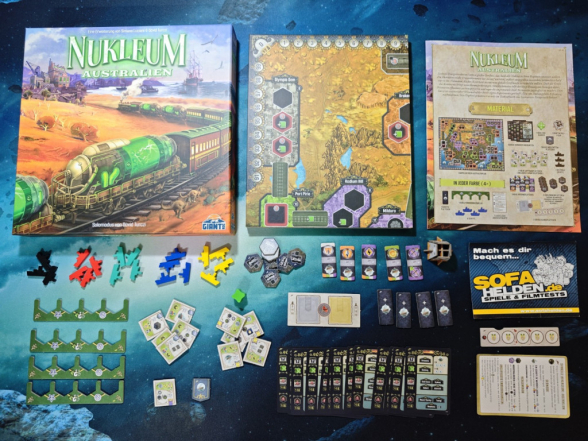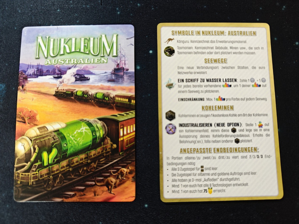 Um die Energieversorgung des Kontinents zu gewährleisten, legst du die Kohleimportwagen-Plättchen mit der aufgedruckten Seite nach oben auf die dafür vorgesehenen Felder im Kohleimportbereich von Queensland. Neu sind auch die Kohleminen-Plättchen, die auf die in den Städten angegebenen Felder gelegt werden. Vergiss Riesa! Der wahre Stern am Kraftwerkshimmel ist das Experimentelle Kraftwerk in Hobart, der Hauptstadt Tasmaniens; unten rechts auf dem Spielplan zu finden. Das experimentelle Kraftwerk in Hobart ersetzt die Kohlekraftwerksfigur in Riesa aus dem Grundspiel. In Hobart hat ein genialer, wenn auch exzentrischer Wissenschaftler Elsas Erfindung nachgebaut. Dieses Kraftwerk kommt bereits mit einem eingebauten Nukleum, sodass du dir die Mühe des Platzierens sparen kannst. Die Schifffahrtswege sind die große Neuerung in Nukleum: Australien. Sie verbinden Städte auf eine ganz andere Art als die herkömmlichen Eisenbahnlinien des Grundspiels. Du kannst Kohle und Uran über diese maritimen Autobahnen verschiffen. Aber Vorsicht, du kannst nur deine eigenen Boote nutzen, und Elektrizität lässt sich so leider nicht befördern.