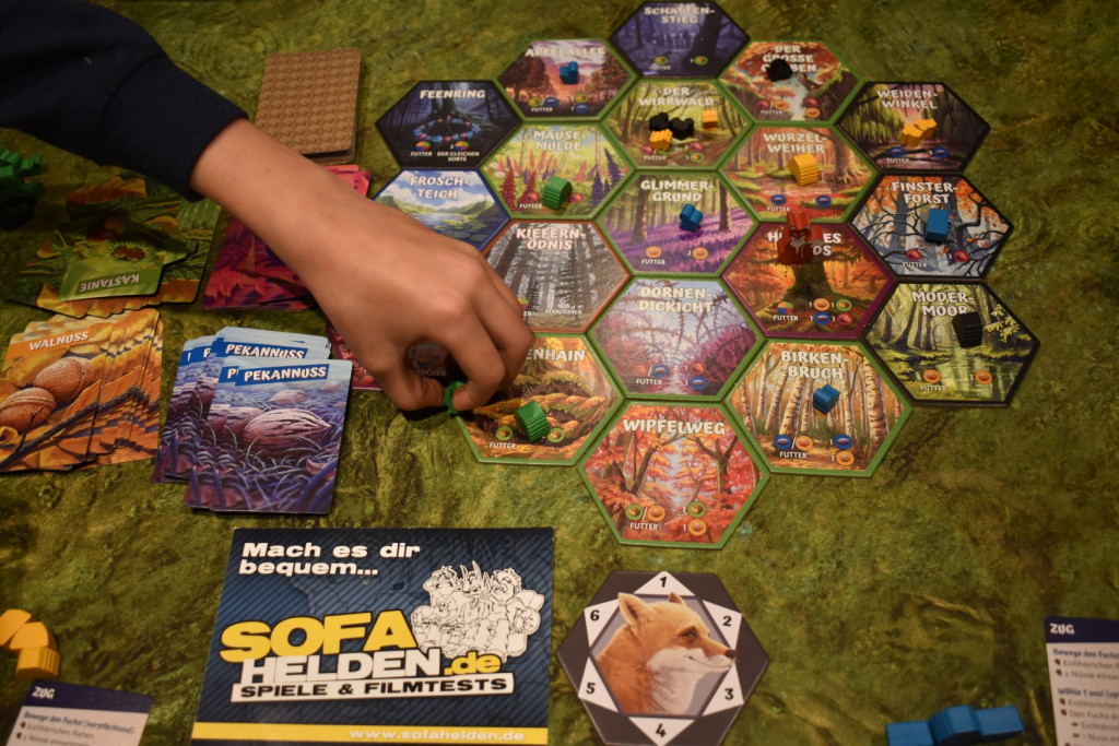 Die Fuchsbewegung ist die größte Zufallskomponente, denn Ihr würfelt mit dem Würfel und bewegt den Fuchs in die Richtung, die Euch der Fuchskompass vorgibt. Da der Fuchs der natürliche Feind der Eichhörnchen ist, fliehen diese im Anschluss von dem Feld, das er betreten hat. Dabei dürfen alle betroffenen Mitspielenden selbst entscheiden, auf welches der angrenzenden Felder die Eichhörnchen laufen. Die einzige Einschränkung ist das Feld, von dem der Fuchs kam, denn das wäre ja im Endeffekt so, als würde man ihm direkt in die Arme laufen. Außerdem gibt es noch den Froschteich, den die Eichhörnchen gar nicht betreten dürfen. Nachdem die Flucht der Eichhörnchen abgehandelt ist, darf die aktive Person Nüsse sammeln. Dies sind immer zwei Stück. Welche gesammelt werden dürfen, gibt das Feld des Fuchses vor.
