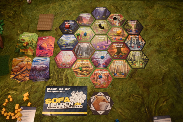 Wie man am Spielverlauf sieht, passiert vieles eher passiv durch die Fuchsbewegung. Hierzu kann auch das Bauen der Kobel gehören. Diese entstehen nämlich, sobald drei Eichhörnchen einer Farbe auf einem Feld stehen. Dabei ersetzt Ihr die drei Eichhörnchen durch einen Kobel-Spielstein. Der Bau eines Kobels führt wiederum zu einer Flucht der andersfarbigen Eichhörnchen. Später dürfen dann aber wieder alle Eichhörnchen auf dieses Feld gestellt und auch weitere Kobel gebaut werden. Doch wofür braucht Ihr die Kobel? Zum einen bringen sie Euch zwei Siegpunkte, zum anderen müssen Sie in einem Revier sein, mit dem Ihr eine Zielkarte erfüllen möchtet. Ein Revier wiederum ist eine zusammenhängende Gruppe aus Waldfeldern, die Ihr mit euren Eichhörnchen oder Kobeln besetzt habt.