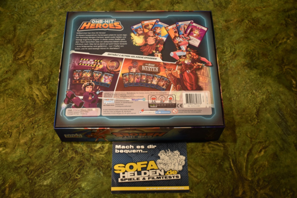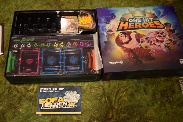 Vielleicht habt Ihr schon unser Unboxing Video zu One-Hit Heroes auf unserem Instagram-Kanal gesehen? Ansonsten erhaltet Ihr jetzt einen kurzen Überblick, was so alles in der Schachtel zu finden ist. Besonders ins Auge stechen einem die Heldentableaus. Sie bestehen aus Karton mit einer Ablagefläche aus Plastik. Irgendwie cool, vom Aspekt der Nachhaltigkeit allerdings doch nicht so richtig. Aber es passt irgendwie zum Spiel, in Richtung Beat ´em up. Ein weiterer Nachteil bei unserem Spiel war, dass sich die Ablagefläche der Energieleiste bei einem unserer Tableaus nach oben verbogen hatte. Hier werden wir nochmal mit einem Föhn oder ähnlichem nachbessern müssen. In Zipp-Beuteln findet Ihr die Schadens- beziehungsweise Aggromarker für leichten und schweren Schaden sowie die Energieanzeiger. Unter den Tableaus befinden sich die Fächer für die Boss-Karten und Tableaus sowie sechs Booster-Packs mit Karten, die Ihr im Zuge des Spiels erhaltet. Die Karten sind allesamt eingeschweißt und lassen sich nur sehr schwer auspacken, da es keine Aufrisshilfe oder ähnliches gibt. Ansonsten macht das Spielmaterial aber einen sehr guten Eindruck und auch das Inlay ist super, da die Karten hier ordentlich sortiert werden können. Auch die Fächer für die Boss-Karten sind sehr durchdacht. Generell ist uns aufgefallen, dass die Schadensmarker unterschiedliche Formen und Größen haben und die Aggro-Symbole nicht nur unterschiedliche Farben, sondern auch im Rahmen unterscheidbar sind. So dürfte das Spiel auch für Farbenblinde gut spielbar sein.