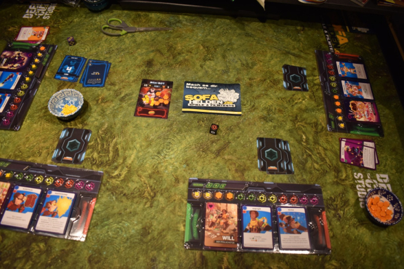 Für den Spielaufbau müsst Ihr Euch erst einmal für eine Episode entscheiden. Das Spiel enthält zwei Episoden mit jeweils vier Bossen. Im Regelfall fangt Ihr mit Episode eins an. Ihr nehmt Euch das Boss-Tableau, lest die Rückseite (das solltet ihr in jedem Fall tun!) und nehmt Euch alles weitere benötigte Material. Hierzu gehört in der Regel das Kartendeck des Bosses (nicht mischen!) und die Schadensmarker, die Ihr auf sein Tableau legt. Anschließend nehmt Ihr Euch jeweils ein Tableau und einen Charakter mit dazugehörigem Deck. Die Charakterkarte legt Ihr auf Euer Held-Feld und zwei eurer Ausrüstungskarten auf die entsprechend markierten Bereiche Eures Tableaus. Auf eure Aggroleiste legt Ihr drei Schadensmarker, sodass die drei weißen Felder verdeckt sind. Dies ist Eure Aggro am Anfang eines Bosskampfes. Anschließend legt Ihr noch den Energieanzeiger so auf Eure Energieleiste, dass Ihr alle drei Energiesymbole seht. Die beiden Würfel legt Ihr in die Tischmitte und bestimmt eine Person, die anfängt. Bevor es nun losgeht mischt Ihr noch Eure Decks und zieht jeweils fünf Karten auf die Hand.