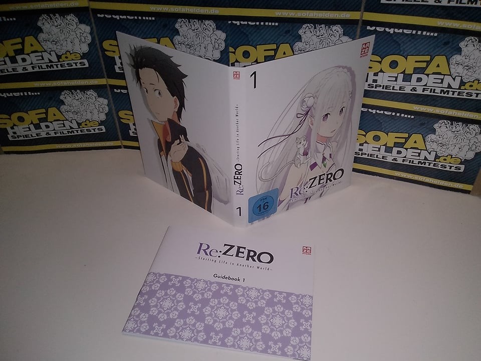 Die erste Volume von Re:ZERO - Starting Life in Another World erscheint in einem dicken Sammelschuber aus stabilem Karton, der Platz für die noch kommenden Veröffentlichungen bereithält. Der Schuber selbst zeigt ringsum einige Charakteraufnahmen, selbstverständlich auf der Front von Subaru und Emilia. Die Inhaltsangaben und Details der ersten Volume befinden sich auf einem losen Begleitblatt, welches um den Schuber angebracht wurde. Die Volume selbst befindet sich als Digipak in einem separaten Schuber, dessen Cover Emilia und ihren Begleiter Puck zeigt, während die Rückseite eine Übersicht über die Episoden liefert. Das Digipak selbst zeigt auf der Front ebenfalls Emilia, auf der Rückseite ein Bild von Subaru. Das 28-seitige Booklet bietet Infos zu den Charakteren der Serie sowie einen ausführlichen Episodenguide. Zusätzlich beinhaltet die Edition einen wertigen Schlüsselanhänger mit einem Motiv von Puck.
