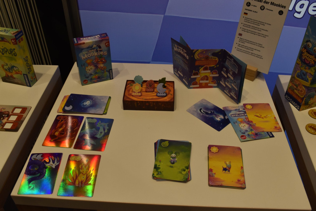 Ebenfalls am Amigo-Stand befand sich der Verlag Peasoup, der zwei „Spielbücher“ herausbringt, die uns gerade mit einem Kind in der Grundschule besonders gelockt haben. In einer Kombination aus klassischem Abenteuerbuch, einer App und Karten sind wir hier sehr gespannt, wie das Spiel bei Kindern ankommt. Dann ging es weiter zu Hutter, die sich nun auch mit um den Vertrieb des „Spiel Das!“-Verlags kümmern. Hier gab es interessante Ausblicke auf Jiangnan, Workerplacement in China, das kooperative Bergsteiger-Spiel The Peak Team und ein paar interessante Logik-Spiele. Von „Spiel Das!“ stach uns vor allem das uns bereits bekannte Aqualuma und Aelos ins Auge. Aber auch Raising Robots und die Vielfalt an Würfel- und 2-Spieler-Spielen weckten unsere Aufmerksamkeit.