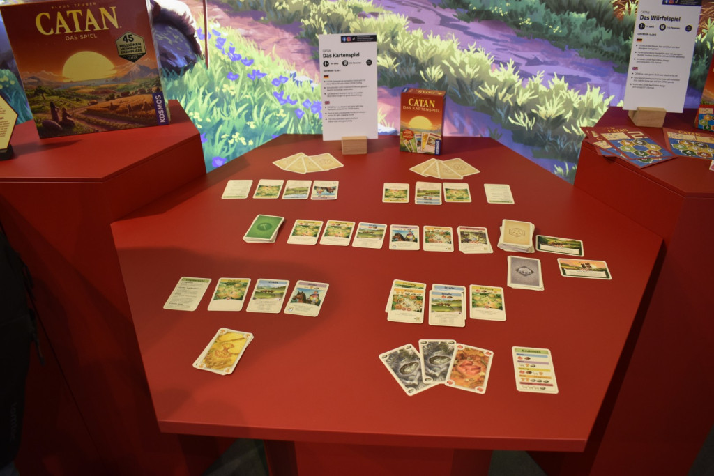 Den Abschluss des Tages machte Kosmos. Hier gab es ordentlich auf die Ohren, denn man bringt hier nun auch ein Musikspiel im Hitster-Stil heraus. Play macht aber ein paar Sachen anders. So kann man sich vorab pro Team für unterschiedliche Genres zum Raten entscheiden und man hat unterschiedliche Spielmodi, wie beispielsweise „früher“ und „später“, die sich aber auch auf die Erscheinungsjahre der Titel beziehen. Dafür ist man allerdings nicht auf Spotifiy eingeschränkt, sondern kann auch andere Anbieter wie beispielsweise Apple Music verwenden. Darüber hinaus gab es einige Kartenspiele zu entdecken, von denen uns besonders die Neuauflage von Catan - Das Kartenspiel nahegelegt wurde. Hier sind wir schon sehr gespannt. Es macht einiges anders und einfacher. Besonders interessant wirkte der Aufbau von Temple Twist, einem kooperativen Labyrinth-Spiel, das dieses Jahr sogar den Toy Award gewinnen konnte. Mit Kosmos und schweren Füßen endete dann auch unser erster Messetag etwas früher. Schließlich wussten wir, dass der Donnerstag mit der Red Night etwas länger werden würde.