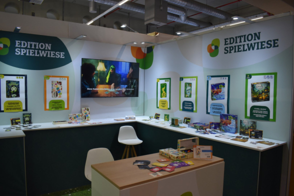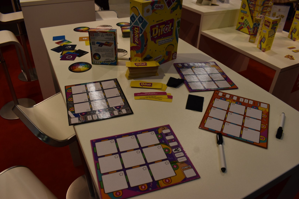 Den Abschluss der Messe machte für uns dann Game Factory. Hier gab es neben der Kollektion aus Minispielen wie beispielsweise Auf die Eier, noch einige familientaugliche Spiele zu entdecken. Da mir Spiele mit Memory-Komponente nicht so liegen, blieb bei mir vor allem das interessante Legespiel chroma und das Partyspiel Dito! hängen. chroma erinnert ein wenig an Domino. Man muss Farbkarten so auslegen, dass die angrenzenden Karten mit den passenden Farben auf dem Farbkreis übereinstimmen. Hinzu kommen dann noch einige Sonderkarten. Bei Dito! geht es darum, Begriffe zu finden und auf einem 3x3 Tableau einzutragen. Diese sollten nur mit einer und nicht mehr Personen übereinstimmen, um möglichst viele Punkte zu erhalten.
