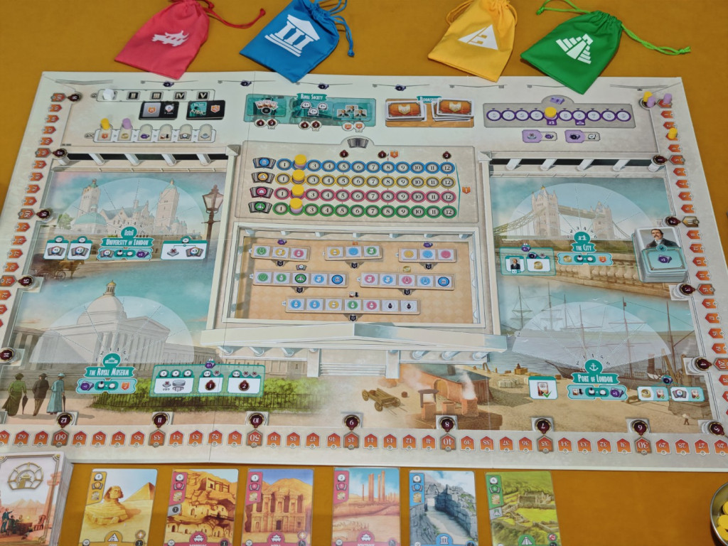 Der Spielplan zeigt mehrere Leisten, auf denen die Spieler ihre Marker platzieren. In der Mitte des Spielplans befinden sich vier Wissensleisten, die jeweils einer der vier Regionen zugeordnet sind. Das Wissen in einer Region ist eine der Voraussetzungen für dortige Expeditionen. Um den Spielplan herum verlaufen die Prestige- und Gelehrsamkeitsleisten. Am Spielende entspricht die Punktzahl des am wenigsten fortgeschrittenen Markers den erreichten Siegpunkten. Oben rechts befindet sich die Ansehensleiste. Ansehen ist teils Ressource und teils Voraussetzung für das Ausführen bestimmter Aktionen.