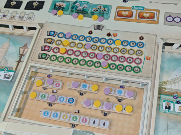 Und zu guter Letzt gibt es in The Royal Society zwei Siegpunktleisten: Prestige und Gelehrsamkeit. Am Spielende zählt nur der Punktewert der Leiste, auf der man am wenigsten weit vorangeschritten ist. Man sollte also schön darauf achten, beide Leisten zu pushen!