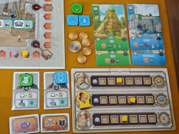 Eine weitere Verzahnung ergibt sich aus den Expeditionen und Relikten: Gerade zu Spielbeginn haben alle Arbeiter eine relativ niedrige Expertise und können alle Aktionen nur entsprechend schwach ausführen. Die Expertise dauerhaft zu erhöhen, funktioniert fast ausschließlich durch das Abschließen von Expeditionen. Das sorgt dafür, dass dieses Hauptziel nie aus den Augen verloren wird. Auf der anderen Seite will man nicht einfach irgendeine Expedition abschließen, denn zum einen kostet das Geld und eine Aktion – beides ist streng begrenzt –, zum anderen gibt es Zusatzpunkte am Spielende, wenn die Expeditionskarten zu den eigenen Studienkarten passen (Set-Collection!). Außerdem muss man darauf achten, Expeditionen durchzuführen, die bestimmte Relikte als Belohnung bieten, da passende Relikte für andere Aktionen benötigt werden, mit denen man ebenfalls Siegpunkte generiert.