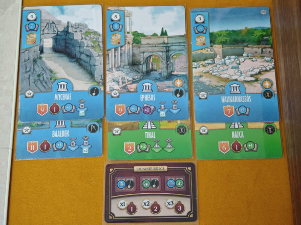 Oberhalb des Spielplans wird der gemischte Kartenstapel mit Expeditionskarten ausgelegt, wovon sechs offen in die Auslage kommen. Sie existieren in vier Farben (Rot, Grün, Gelb, Blau), entsprechend den vier Regionen im Spiel (Afrika, Mittelmeer, Asien, Südamerika). Erfüllt man die oben links auf der Expeditionskarte aufgeführten Bedingungen, kann man im Spielverlauf die entsprechende Expedition ausführen und die im unteren Bereich angegebenen Belohnungen erhalten. Das sind häufig auch farblich passende Reliktmarker. Diese werden in den farblich passenden Stoffbeuteln sortiert und von dort oft zufällig gezogen.