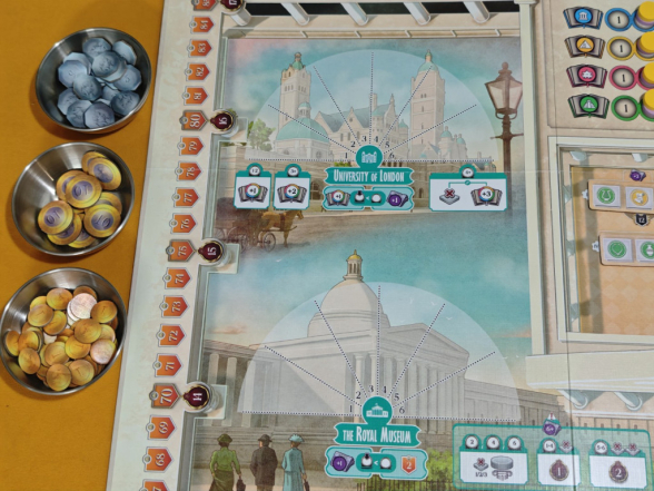 Der Ort „The Royal Museum“ ermöglicht zwei Aktionen, mit denen man Relikte in Siegpunkte eintauscht. Mit der Aktion „Relikt ausstellen“ darf man abhängig von der Expertise des eingesetzten Arbeiters ein, zwei bzw. drei Relikte abwerfen und auf die passenden Felder der Sammlungsplättchen im Museum Gesellschaftsscheiben platzieren, um anzuzeigen, dass man das entsprechende Relikt ausgestellt hat. Je nach Sammlungsplättchen, auf dem man seine Scheibe platziert, erhält man unterschiedliche Sofortboni; außerdem entscheidet die Platzierung über die Mehrheitenwertung am Spielende. Alternativ kann man mit der Aktion „ein Relikt studieren“, je nach Expertise, ein oder zwei Relikte abwerfen, um ein oder zwei Gelehrsamkeit zu erhalten.