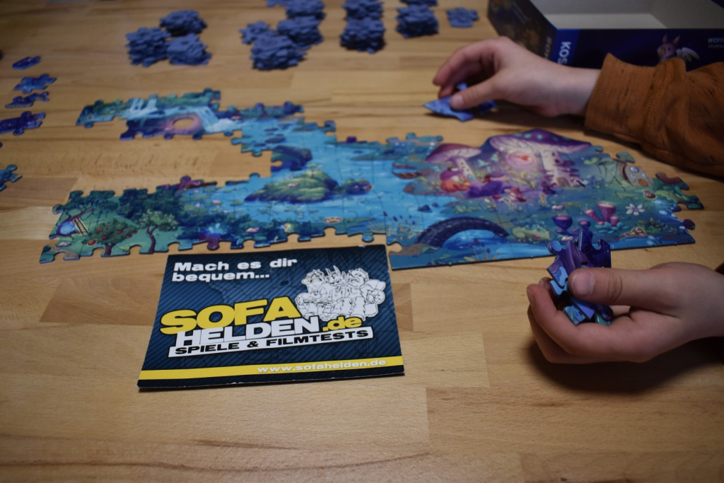 Gemäß dem Abenteuerbuch fangt Ihr mit den Puzzelteilen mit Portal-Symbol an. Ihr puzzelt sie zusammen und betrachtet sie genau. Dabei werdet Ihr gelb umrandete Gegenstände entdecken. Diese solltet Ihr Euch aus Eurem Vorrat nehmen und bereitlegen. Außerdem werdet Ihr Buchseiten finden, die Euch anweisen, im Abenteuerbuch weiterzulesen. Dabei erhaltet Ihr Aufgaben, deren Lösungen die Gegenstände sind. Sobald Ihr der Meinung seid, Ihr habt den passenden Gegenstand, dreht Ihr ihn um und findet dort ein Symbol, das wiederum auf den Puzzleteilen zu finden ist. Nun nehmt Ihr von diesem Stapel das umrandete Puzzleteil und versucht es an Eure bereits zusammengesteckten Teile anzubauen. Gelingt das, lagt Ihr mit Eurem Verdacht richtig und könnt weiterbauen. Zur Kontrolle findet Ihr im Abenteuerbuch auch immer die Stelle, wo das Teil angebaut werden sollte oder die Lösung in der Anleitung. So bewegt Ihr Euch durch den Zauberwald und löst Rätsel, von denen manche ein wenig anders sind und nicht optimal beschrieben. Doch insgesamt ist das Ganze gut mit Kindern durchzuspielen und Ihr endet mit einem fertigen Puzzle.