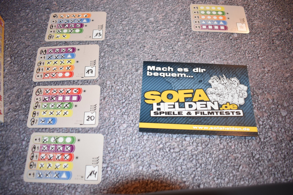 Zwar ist das Spielmaterial zu Alles auf 1 Karte sehr übersichtlich, dafür aber sehr hochwertig. Die Karten sind abwischbar beschichtet und die Holzwürfel mit vertieften geometrischen Figuren machen auch einen sehr guten Eindruck. Eine Überraschung qualitativer Art boten die mitgelieferten Stifte. Hier hat man nicht auf ein günstiges NoName-Produkt zurückgegriffen, sondern hochwertige Faber-Castell Filzschreiber beigelegt. Vor dem ersten Spiel müssen die Karten nur aus der Plastikfolie entnommen werden und die ersten Runden können auch schon beginnen.