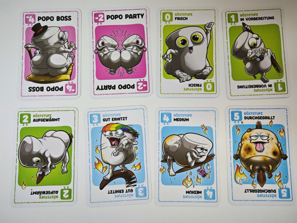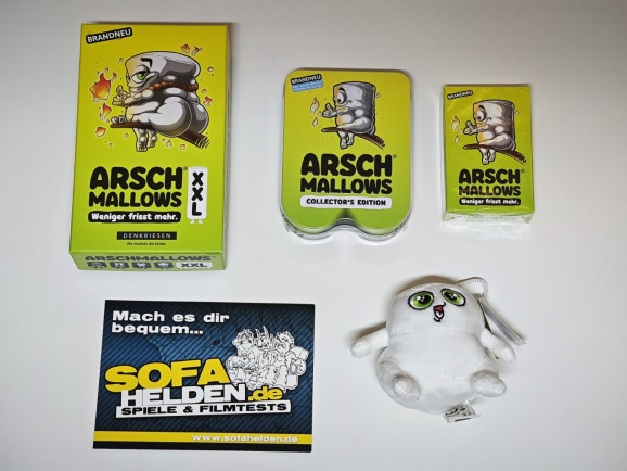 Zuletzt gibt es noch die XXL Variante, die mit 120 Karten in 18 Röststufen daherkommt. Diese Variante enthält mehr als doppelt so viele verschiedene Aktionskarten wie die Original-Version. Außerdem liegt die Babo-Figur, eine bemalte Miniatur eines Arschmallows bei, die auch im Spiel seinen Zweck hat. Ihr wollt noch mehr? Der Verlag hat sogar Arschmallows-Kuscheltiere im Angebot.