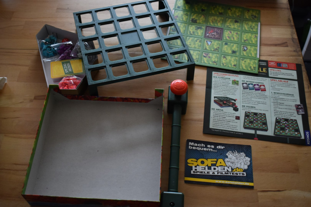 Auffällig beim Auspacken ist, dass die Unterseite der Verpackung Teil des Spielfeldes sein wird. Hinzu kommt das Arena-Gestell aus Kunststoff und der spielentscheidende rote Knopf - genannt Eliminator. Letzterer ist uns sehr positiv aufgefallen, denn dass die Kinder ihn kaputthauen, ist das Erste, das man als Eltern befürchtet. Aber man muss leicht drücken, damit die Mechanik ordentlich auslöst. Es wird also kein „Buzzer-Battle“. Separat in Zipp-Beuteln sind die Spielfiguren verpackt. Die Karten sind eingeschweißt und neben der Anleitung gibt es noch einen Stanzbogen mit den Spielfeld-Plättchen. Hierbei müsst Ihr aber aufpassen, denn während die Plättchen für das Spielfeld benötigt werden, wird der Rahmen des Stanzbogens als Justierhilfe für den Eliminator benötigt. Sobald alles ausgepackt ist, kann es auch schon an den eigentlichen Spielaufbau gehen.