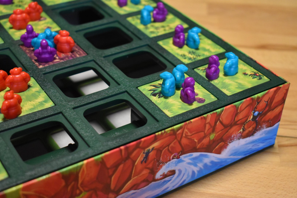 Sobald Ihr an der Reihe seid, spielt Ihr in der Bewegungsphase eine Eurer Handkarten. Jede Karte zeigt Euch an, wie viele Eurer Figuren Ihr bewegen dürft und wie weit Ihr mit jeder dieser Figuren laufen dürft. Bewegen dürft Ihr Euch jeweils auf orthogonal angrenzende Felder, außer bei einer Sonderkarte, die Euch explizit anweist, diagonal zu laufen. Außerdem gibt es noch eine Karte, bei der Ihr gegnerische Figuren bewegen müsst. Darüber hinaus gibt es noch Karten für den Kampf, für das Bewegen sowie Auslösen des Eliminators. Die Karten werden im Prinzip von oben nach unten ausgeführt. Als erstes lauft Ihr. Dabei kann es passieren, dass Ihr am Ende auf einem Feld landet, auf dem schon fünf Figuren stehen. Ist das der Fall, schubst Ihr eine Figur Eurer Wahl auf das nächste benachbarte Feld in Eurer Bewegungsrichtung. Ist dort ein Loch, so fällt sie runter und Ihr erhaltet die Figur als Beute. Wenn Ihr den Eliminator bewegt, dürft Ihr ihn in eine beliebige Richtung (orthogonal oder diagonal) an ein angrenzendes Feld bewegen (kein Loch und nicht die Mitte). Löst Ihr ihn aus, drückt Ihr den Knopf. So fliegt ein Plättchen mit Figuren nach oben. Nun müsst Ihr gucken, wo die darauf befindlichen Figuren gelandet sind. Alle Figuren, die runtergefallen sind, werden in die Schachtel gelegt, alle Figuren, die auf einem Feld gelandet sind, werden dort wieder aufgestellt. Wenn Eure Karten die überkreuzten Schwerter zeigen, beginnt der Kampf. Hierbei prüft Ihr alle Felder einzeln auf Mehrheiten. Diese Farbe darf eine beliebige der anderen Figuren ausschalten und die Figur als Beute nehmen.