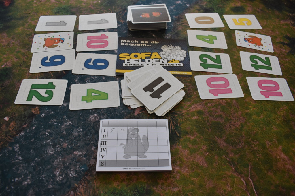 Anders als man vielleicht vermuten würde, geht es bei der Biber-Gang nicht darum, das höchste Schutzgeld aus dem Försterverband zu erpressen, sondern möglichst wenig Punkte zu erreichen. Die Alternative wäre auch etwas seltsam für ein Kinderspiel. Nach und nach werden alle Karten aufgedeckt. Dann endet die Runde und die Punkte werden auf dem Block notiert. Nach fünf Runden werden die Punkte zusammengezählt und es gewinnen entgegen der gängigen Praxis die wenigstens Punkte.