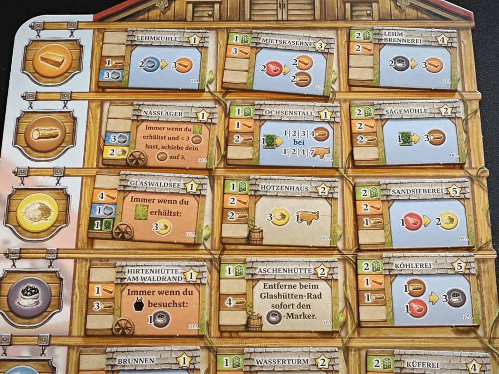 Dann kommt eine weitere wichtige Aktion ins Spiel: der Produktionsfortschritt der Glashütte muss verbessert werden. Ganz simpel: wenn ihr einen Handwerker mit der entsprechenden Aktion besucht, schiebt ihr euren Fortschrittsmarker auf eurer Glashütte eins nach oben. Ist er nach drei Aufwertungen oben angekommen, so erhaltet ihr einen neuen Vorhof, der Platz für 8 weitere kleine (oder vier große) Plättchen bietet. Ihr bekommt auch direkt zwei neue Waldstücke, die ihr abholzen könntet, um Holz zu generieren. Vorhöfe geben auch direkt Siegpunkte, also rechtzeitig darauf hinarbeiten, denn euer Gutshof bietet zu Spielbeginn nicht sehr viel Platz. Habt ihr euren neuen Vorhof ausgelegt, wird das Glashütten-Plättchen auf den neuen Vorhof platziert und der Fortschrittsmarker wieder an den Anfang der Leiste gelegt. Bringt ihr den Fortschrittsmarker wieder ganz nach oben, bekommt ihr einen weiteren Vorhof. Das lässt sich beliebig oft wiederholen.