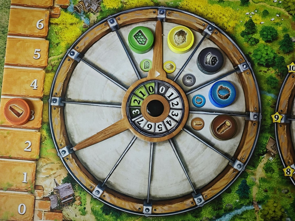 Die Ressourcenräder gab es zum ersten Mal in Die Glasstraße, ein Kennerspiel aus dem Jahr 2013. Wie genau funktionieren diese Räder? Am äußeren Rand des Rads sind Felder für die Ressourcenscheiben, wie auf einer Leiste. Am Inneren Rand stehen Zahlen, welche angeben wie häufig die Ressource vorhanden ist, abhängig davon auf welchem Feld sie liegt. Der Clou ist die automatisierte Produktion hochwertiger Ressourcen. Als Beispiel schauen wir uns mal das rechte Ressourcenrad an. Rechts vom Zeiger findet man die einfachen Ressourcen Brei, Fleisch und Kohle. Links vom Zeiger liegt die hochwertige Ressource Proviant. Sobald man jeweils 1 Brei, 1 Fleisch und 1 Kohle hat gibt es ein freies Feld rechts des Zeigers. Dann muss man den Zeiger nach rechts schieben, wodurch automatisch 1 Proviant produziert und 1 Brei, 1 Fleisch und 1 Kohle ausgegeben wird. Man beachte: dies ist verpflichtend, also aufpassen, falls Du zum Beispiel eigentlich Fleisch brauchst!