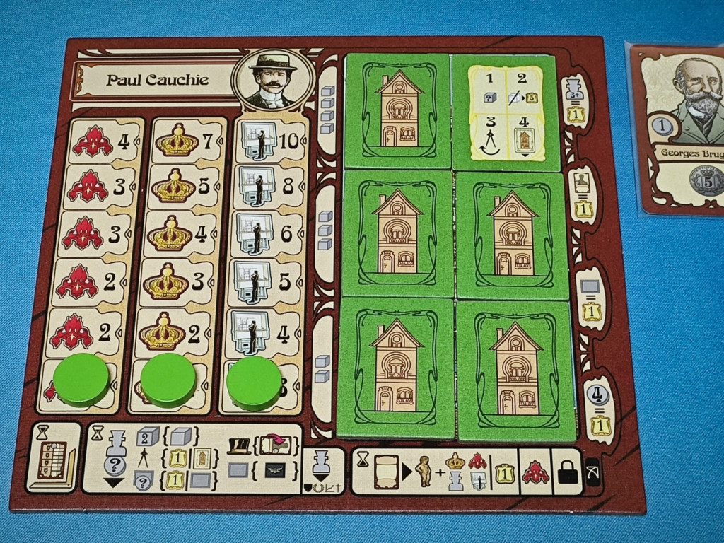 Außerdem gibt es den zusätzlichen Rohstoff Glas, der nun im Zirkel nicht mehr durch den Pfeilmarker überdeckt wird. Häuser können nicht auf die fünf Felder mit Belle Époque Plättchen gebaut werden, dafür aber gibt es 5 neue Bauplätze auf dem Siegpunkte-Spielplan, neben den ausgelegten Belle Époque Karten. Ein Bau hier kann zusätzliche Kosten verursachen. Als Belohnung gibt es die Belle Époque Karte daneben, die man bis zum Ende der Partie einmal pro Runde verwenden kann. Diese Karten bieten viele unterschiedliche Boni und Fähigkeiten in bestimmten Spielsituationen, z.B. beim Ausführen einer bestimmten Aktion, bei bestimmten Mehrheiten-Wertungen oder am Ende der Runde.