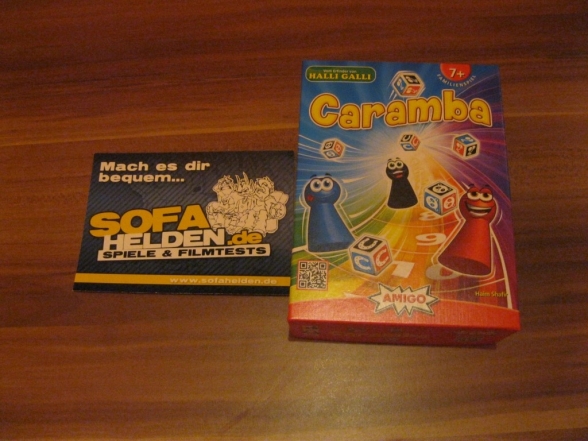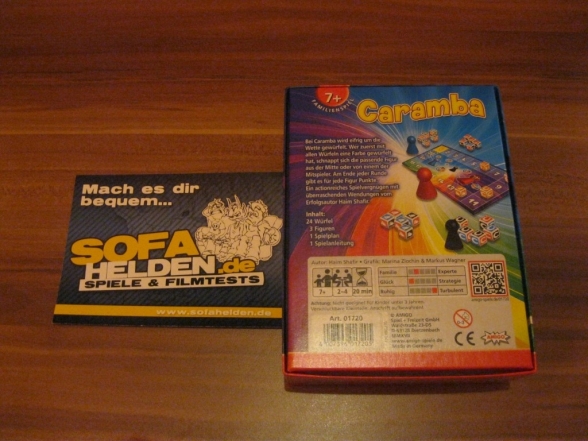Caramba spricht von der Verpackungsgestaltung her eher jüngere Spieler an. Auf der Front sind die drei enthaltenen, verschiedenfarbigen Spielfiguren comichaft dargestellt. Sie versprechen viel Spaß mit Würfeln. Auf der Rückseite ist wie üblich ein beispielhafter Spielaufbau mit einer kurzen Beschreibung zu sehen. Im Inneren der Verpackung befindet sich unter der Anleitung ein einfach zusammengeklapptes Spielbrett. Darunter, wesentlich größer als erwartet, drei massive Holzspielfiguren in einem wiederverschließbaren Beutel. Außerdem, ebenfalls in einem solchen Beutel, vierundzwanzig Würfel.