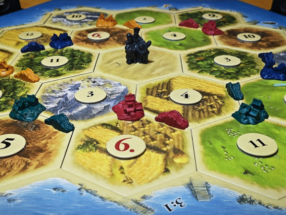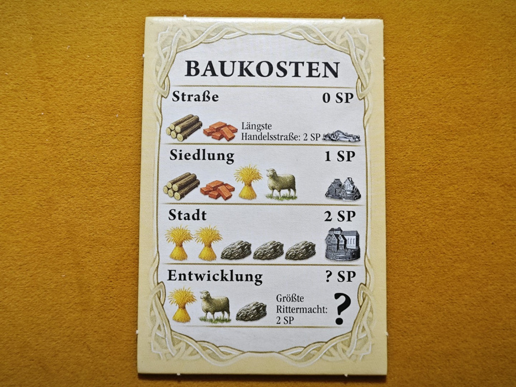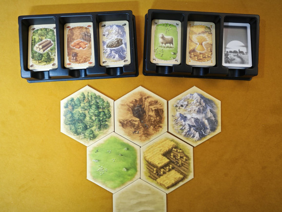 Die Spielvorbereitung geht superschnell. In der Tischmitte wird der Spielplan ausgebreitet. Er besteht aus Hex-Feld-Plättchen, die entweder in einer vorgegebenen Anordnung für Einsteiger oder in variabler Anordnung ausgelegt werden können. Diese Felder zeigen sechs verschiedene Landschaften: Wald, Hügelland, Weideland, Ackerland, Gebirge und Wüste. Im Spielverlauf erzeugen die ersten fünf genannten Landschaften jeweils einen bestimmten Rohstofftyp: Holz, Lehm, Wolle, Getreide und Erz. Diese Rohstoffe gibt es in Form von Rohstoff-Karten, die als offene Stapel neben dem Spielplan bereitgelegt werden. Neben den Rohstoff-Karten wird der verdeckte, gut gemischte Stapel aus Entwicklungskarten sowie die zwei Sonderkarten „Längste Handelsstraße“ und „Größte Rittermacht“ bereitgelegt.
