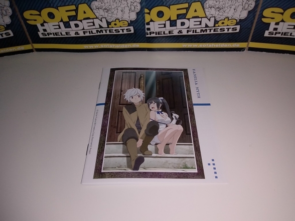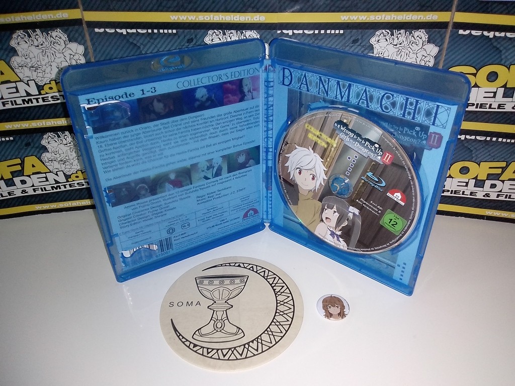 Die Collector´s Edition zu Danmachi - Staffel 2 - Vol. 01 setzt das Design der bisherigen Veröffentlichungen von Anime House konsequent fort. Erneut liefern sowohl der O-Card Schuber wie auch die Softbox das gleiche Covermotiv - im aktuellen Fall passenderweise ein Bild von Bell Cranel und Hestia - und auch die Rückseiten mit den obligatorischen Inhaltsdetails unterscheiden sich lediglich von der Angabe der zusätzlichen Gimmicks auf dem Schuber. Bei den Zugaben ist man der bisherigen Linie ebenfalls treu geblieben, weshalb es sich dabei wieder um einen Magnet-Button sowie einen Untersetzer handelt. Der Magnet-Button zeigt das Gesicht von Liliruca Arde aus der Soma-Familia, während der Untersetzer Soma höchstpersönlich präsentiert. Das Booklet liefert einen ausführlichen Episodenguide sowie zusätzliche Informationen zu einigen Familias und zahlreichen Charakteren.