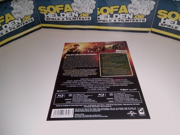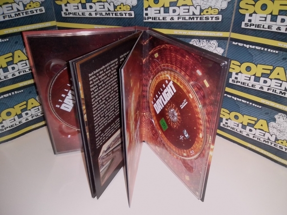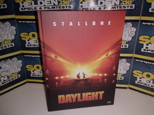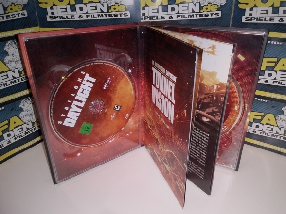 Beim Cover des Mediabooks hat sich Turbine dazu entschieden, das bekannte Motiv der bisherigen Veröffentlichungen weiterhin zu nutzen. Lediglich die Rückseite, überdeckt vom lose aufgelegten Begleitblatt, liefert mit einem Szenenbild von Sylvester Stallone und Danielle Harris eine ansprechende Neuerung. Wie bereits das Mediabook von Dragonheart wurde auch das Mediabook von Daylight mit einem matten, griffigen Finish versehen. Der Innendruck besteht aus einer Montage diverser Szenenbilder des Films und ist im Stil "Flammendes Inferno" gehalten. Auch inhaltlich weiß die Neuauflage von Turbine zu gefallen, denn erstmals kommen die Fans in den Genuss von Bonusmaterial, das über simple Produktionsnotizen hinausgeht. Dazu gehört neben den bislang der HD-DVD vorbehaltenen Extras wie ein Audiokommentar von Regisseur Rob Cohen, zwei Featurettes sowie dem gut halbstündigen Making Of auch das Featurette "Memories with Muscle", in welchem Make-Up Legende Giannetto De Rossi über seine Arbeit mit Sylvester Stallone plaudert. Abgerundet wird das Mediabook von einem stolze 40 Seiten umfassenden Booklet mit einem Vorwort von sowie einem Interview mit Regisseur Rob Cohen, in welchem sich Tobias Hohmann (wie bereits bei Dragonheart) ausführlich mit der Entstehungsgeschichte und Hintergründen des Films beschäftigt.