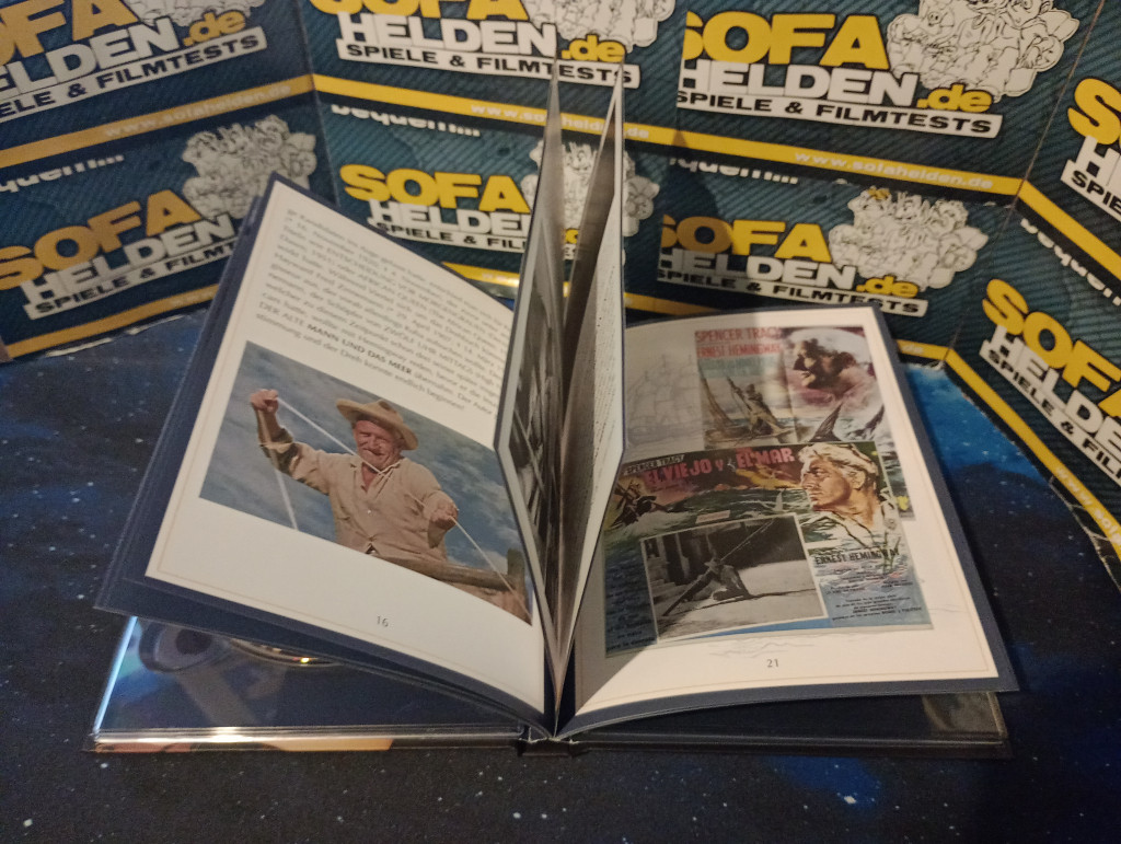 Während auf der Rückseite des Mediabooks die üblichen Inhaltsangaben und Details direkt aufgedruckt wurden, bietet das Cover das bereits von der DVD-Veröffentlichung bekannte Motiv eines nachdenklichen Spencer Tracy. Ein mattes Finish sowie die dezente, in Brauntönen gehaltene Farbgestaltung sorgen dabei für einen harmonischen nostalgischen Look. Der sehr dezente Innendruck besteht aus einer Kollage von Szenenbildern und wird - wie auch die Discs - von seiner blauen Färbung dominiert. Ein 36-seitiges Booklet mit einer umfassenden Entstehungsgeschichte zum Film von Christoph N. Kellerbach sowie einem Interview von Steffen Wulf mit dem finalen Drehbuchautor Peter Viertel rundet das Mediabook zusammen mit zahlreichen Szenenaufnahmen und Filmplakatmotiven sehr schön ab.