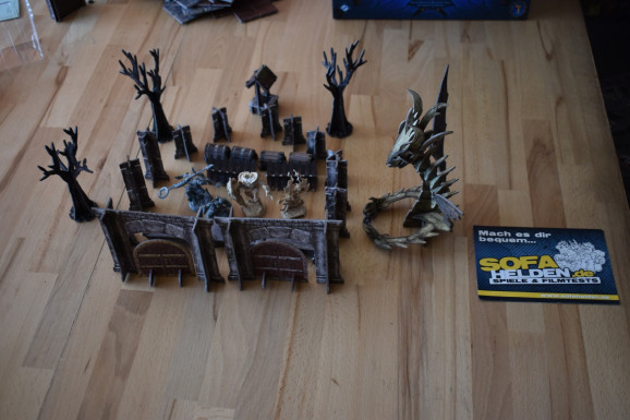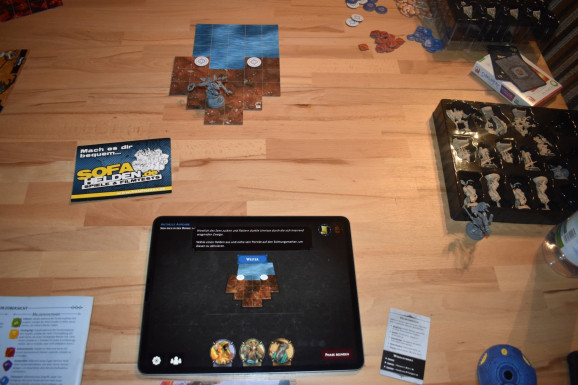 Der Spielaufbau gestaltet sich an sich relativ einfach. Man muss sich die kostenlose App herunterladen und wird dann durch den Aufbau geführt. Zunächst sucht man sich Helden aus, zu denen jeder Spieler das entsprechende Material erhält. Hierzu gehören die Heldenkarte, die Figur, das Lebensrad und die Startwaffen. Letztere haben noch eine Besonderheit. Jede*r Held*in hat davon zwei. Sie werden mit der „Upgrade-Seite“ nach innen in eine Hülle gesteckt, sodass eine Waffe auf der Vorderseite und eine auf der Rückseite zu sehen ist. Die Mitspielenden haben die Wahl, welche der Waffen oben liegt. Aus den übrigen Karten, Markern und Geländeteilen wird jeweils ein Vorrat gebildet. Dann geht es an den Aufbau des Szenarios. Dafür richtet man sich strikt nach der App, was man im Prinzip schon aus Spielen wie beispielsweise Herr der Ringe - Reise durch Mittelerde kennt. Dann kann es auch schon losgehen…