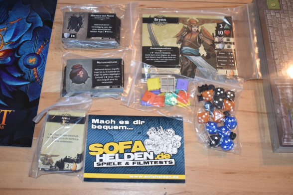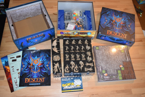 Wie bereits erwähnt wird beim Umfang des Spielmaterials schon einmal geklotzt. Besonderes Highlight sind hierbei die 40 Kunststofffiguren. Sie sind sehr liebevoll und detailliert gestaltet und müssen vor dem ersten Spiel auch noch zusammengesteckt werden. Außerdem gibt es zahlreiche Würfel und ID-Marker. Hier seien letztere positiv hervorgehoben, bei denen man auch an Spielende mit Farbsehschwäche gedacht hat. Da Descent sehr kartenlastig ist, gibt es auch hiervon einige, die bereits in wiederverschließbaren Zipp-Beuteln untergebracht sind. Für bestimmte Kartenarten liegen sogar noch Hüllen bei. Neben den noch relativ gewöhnlichen Spielplanteilen und Unterlagen gibt es aber auch - und das lässt das Herz der Dungeon-Crawler-Fans höher schlagen - eine Menge an 3D-Geländeteilen, die gemäß der beiliegenden Bauanleitung zusammengesetzt werden müssen. Natürlich gibt es auch noch einige Marker, die wie das übrige Kartonmaterial erst aus Stanzbögen herausgedrückt werden müssen. Hier ist man erstmal eine Zeitlang beschäftigt. Interessant ist das Verpackungsdesign, denn anders als das Äußere vermuten lässt, ist es nicht eine „verlängerte“ Schachtel, sondern eine Schachtel mit zwei Bodenteilen, die sich auseinandernehmen lassen. So kann man alle zusammengebauten Teile im unteren Verpackungsboden unterbringen und den Rest mit Karten, Kartenteilen und den Figuren im oberen Verpackungsboden. Der Umfang des Spielmaterials ist einfach der Wahnsinn und rechtfertig auch den vermeintlich hohen Preis.
