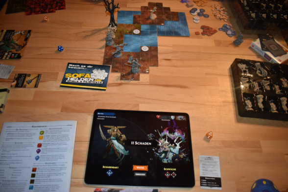 Der Kampf wiederum bietet Gewohntes mit einer Prise Neuem. So gibt es auch hier - je nach Waffe - spezielle Würfel, die geworfen werden müssen und verschiedene Symbole enthalten. Es gibt allerdings drei Arten von Symbolen. Erfolge, die sich in Proben und Kämpfen direkt als solche einsetzen lassen, Vorteilssymbole, die man durch das Platzieren von Erschöpfungsmarkern auf seinen Karten in Erfolge umwandeln kann, und Energiesymbole. Letztere können für spezielle Fertigkeiten eingesetzt werden, die ein entsprechendes Symbol aufweisen. Interessant ist hierbei, dass man den Schaden nicht selbst ermitteln muss. Man teilt der App mit, mit welcher Waffe man welches Monster angreift sowie die Anzahl der Erfolge und die App ermittelt den Schaden automatisch. Die Spezialfertigkeiten für die letzte Aktionsmöglichkeit sind besondere Fertigkeiten, die durch ein Symbol gekennzeichnet sind und gegebenenfalls sogar mehr als eine Aktion kosten können. Nachdem alle Mitspielenden an der Reihe waren, geht es in die Finsternisphase. Diese wird fast vollständig von der App abgehandelt. So vergeht die Zeit im Abenteuer und die Helden erleiden unter Umständen negative Effekte. Anschließend werden die Gegner aktiviert. Hier gibt die App die Reihenfolge und auch das Ziel vor. Kann das aktivierte Monster aber sein Ziel mit dem Angriff nicht erreichen, so müssen die Spieler prüfen, ob es vielleicht ein anderes Ziel erreichen kann. So gibt es auch in der Finsternisphase einiges zu tun. Nachdem die Gegner sich durch die Heldengruppe gepflügt haben, folgen manchmal noch Ereignisse oder Gegner bereiten Angriffe vor, worüber die App die Spielenden informiert. Auch bei Descent kann es notwendig sein, Proben abzulegen. Diese werden ähnlich der Kämpfe abgewickelt, mit dem Unterschied, dass man zwei schwarze Würfel würfelt und zu den Erfolgen seinen Attributsbonus auf dem Heldenbogen addiert. Nachdem dann auch die Finsternisphase beendet ist, geht es in die nächste Runde. Das geht dann so lange, bis einer der Helden oder Heldinnen quasi das Zeitliche segnet und somit die Gruppe das Abenteuer nicht erfolgreich abschließt oder die letzte Aufgabe erfolgreich beendet wurde.