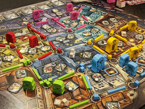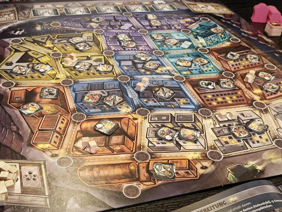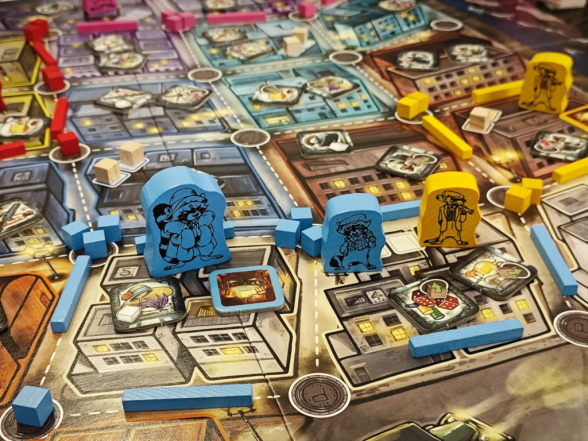 Auf den Spielplan müssen nun zwei Komponenten verteilt werden. In jedes Stadtviertel kommen auf die vorgesehenen Plätze jeweils zwei Beutemarker. Außerdem werden die Geschäftsplättchen zufällig so auf alle Gebiete verteilt, dass ein bis zwei Plättchen in jedem Gebiet liegen, aber niemals dasselbe Geschäft zweimal im selben Gebiet. Denn von jedem Geschäft gibt es im Spiel vier Exemplare und das Sammeln gleicher Geschäfte ist für Set Collection Siegpunkte relevant. Abhängig von der Spielerzahl, werden zuvor 0 bis 5 Geschäfte, also 0 bis 20 Geschäftsplättchen aussortiert.