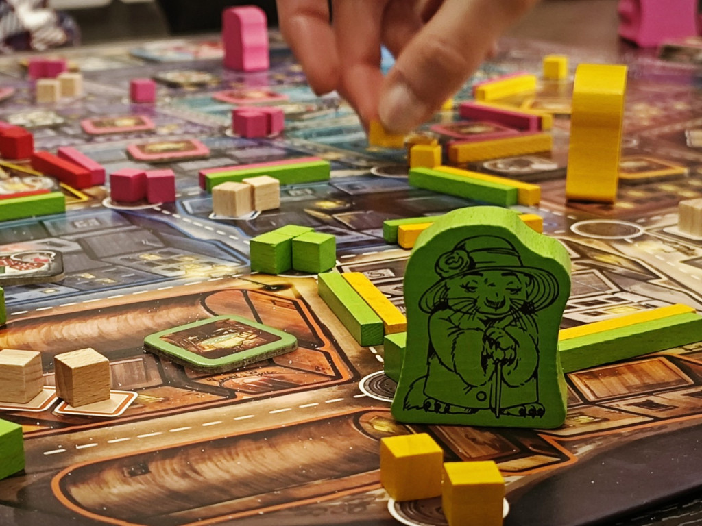 Da wären wir also schon bei der zweiten Aktion „Anspruch erheben“. Das funktioniert prinzipiell nur, wenn eine Figur außerhalb des eigenen Territoriums eingesetzt wurde. Es wird dann überprüft, ob man die Mehrheit an Macht in dem Gebiet hat. Dazu werden die Ratten angrenzender Gullys für jeden Clan gezählt. Jeder Handlanger auf dem Gebiet zählt zusätzlich eine Macht, jede Bossin gibt zusätzlich zwei Macht für den zugehörigen Clan. Hat man die Mehrheit, darf man die Grenzen des eigenen Territoriums so verschieben, dass von nun an das neue Gebiet dazugehört. Gegnerische Grenzen werden entsprechend verdrängt. Befindet sich in dem Gebiet ein gegnerisches Hinterzimmer, wird dieses zerstört. Man erhält das Plättchen als Siegpunkt. Hat man keine Mehrheit, passiert nichts.