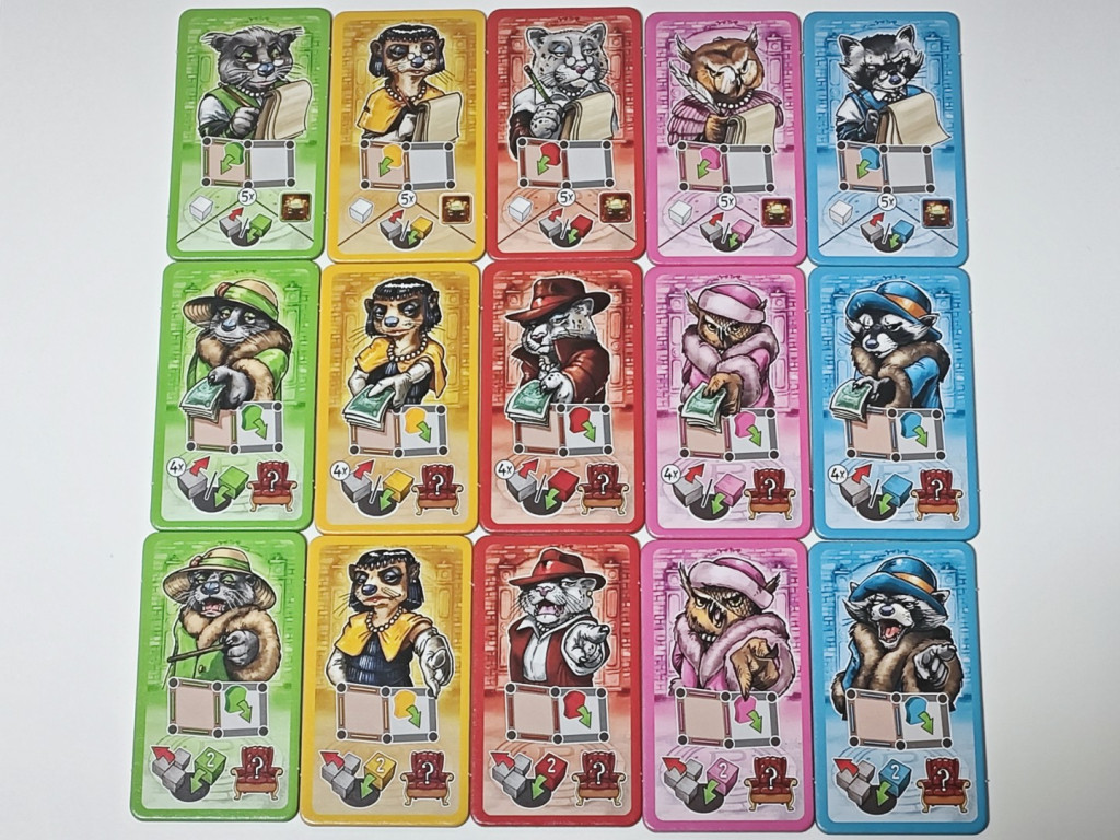 Zu den Rundenzielen: Es gibt insgesamt fünf Rundenziele. Dabei geht es immer um Mehrheiten. Habe das größte Territorium, die meisten Ratten an einem Gully, die meisten Gullys mit Ratten, die meisten Beutemarker oder die meisten Hinterzimmer. Für jedes Rundenziel wird am Ende jeder Runde geprüft, wer es für sich beansprucht. Bei Gleichstand gehen alle leer aus; außerdem kann jeder Spieler in jeder Runde nur ein Rundenziel und dasselbe Rundenziel nur einmal in jeder Partie erfüllen. Zusammengenommen wird es dadurch richtig schwierig in jeder Runde ein Ziel für sich zu beanspruchen. Eine weitere Schwierigkeit: die Siegpunkte für erfüllte Rundenziele sind abhängig von der Runde; so gibt es nur einen Punkt in Runde 1, aber fünf Punkte in Runde 5. Zu den Hinterzimmern: Die errichteten Hinterzimmer selbst geben erstmal keine Siegpunkte. Aber für jedes errichtete Hinterzimmer nimmt man sich eines der Geschäftsplättchen des Gebiets, in dem das Hinterzimmer errichtet wird. Für Geschäftsplättchen gibt es Siegpunkte. Ein Siegpunkt für ein Geschäftsplättchen; drei, sechs bzw. zehn Siegpunkte für zwei, drei bzw. vier Plättchen desselben Typs. Es geht hier also um Set Collection. Zu guter Letzt gibt jedes zerstörte Hinterzimmer eines Mitspielers einen Siegpunkt und ein Geschäftsplättchen jeden Typs – das mit dem Cocktail-Glas-Symbol unten rechts - gibt einen extra Siegpunkt.