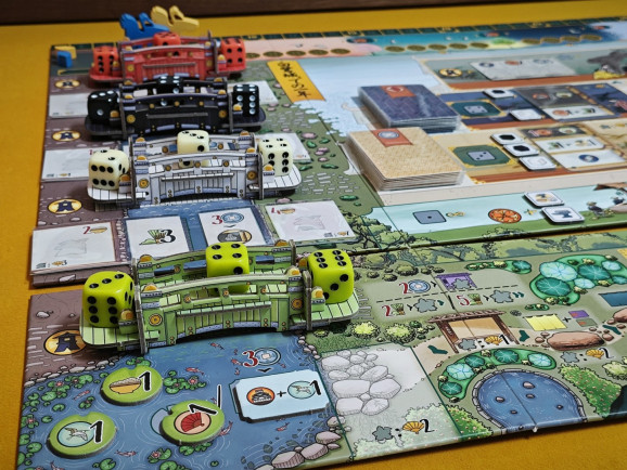 Bei der Bewegung einer Geisha ausgehend vom Eingang zum Teegarten hat man zwei Möglichkeiten. Entweder man geht direkt einen Schritt nach links, dann landet man am Teich. Oder man macht sich über das Umland rechts auf den Weg zum Teehaus; hier bedarf es insgesamt drei Schritte, bis man am Ziel angekommen ist. Der Weg zum Teich direkt unterhalb der Brücke mit den grünen Würfeln ist also schneller erreichbar. Am Teich hat man zwei Optionen. Entweder man nimmt sich die drei Boni, welche auf den drei zu Spielbeginn zufällig ausgelegten Wasserlilien-Plättchen abgebildet sind. Oder man zahlt 3 Geld, um die Aktion auf dem zufällig ausgelegten Zeremonieplättchen auszuführen. Das coole am Teich: er funktioniert so wie die Gärten. Man hat am Ende der Runden eins und zwei erneut die Wahl zwischen Boni und Aktion, falls zum Rundenende noch mindestens ein grüner Würfel auf der Brücke liegen sollte.