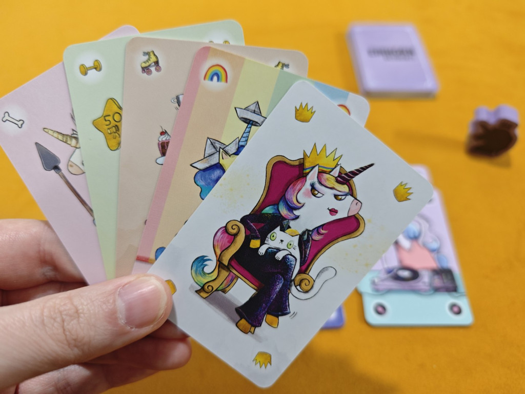 Nachdem man seine sechs Handkarten gesichtet hat, darf man sofort alle Pärchen – also jeweils zwei Karten mit demselben Motiv – in die persönliche Auslage ablegen. Der Startspieler (laut Regel derjenige, der zuletzt Glitzer getragen hat) nimmt sich die lila Einhorn-Holzfigur und beginnt. Danach folgen alle Spieler im Uhrzeigersinn, bis jemand gewonnen hat.
